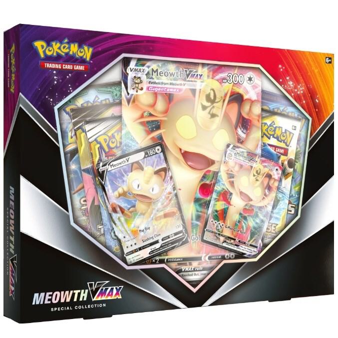 Card Text: The Meowth VMAX Special Collection contains 5 boosters, a Meowth V promo card, Meowth VMAX promo card, and one oversize Meowth VMAX card.